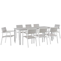 Bordered By The Atlantic Ocean Rests The Maine Outdoor Collection. Distinguished By Its Synthetic Wood Grain Plank Boards, Powder-Coated Aluminum Frame, Inspired Design, And Rich Organic Feel, Maine Stands Out As A Versatile Series For Outdoor Dining. This Contemporary Modern Dining Set Is Perfect For Contemporary Patios, Backyards, Poolside, And Other Outdoor Lounge Areas.Set Includes:Eight - Maine Dining Armchairone - Maine 80' Dining Table