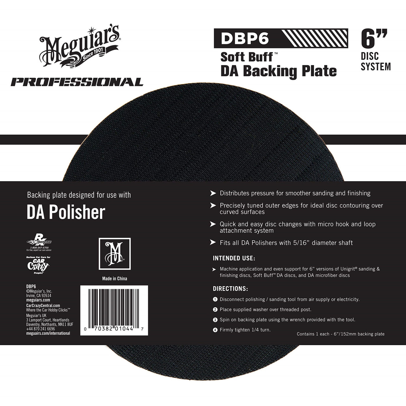 Meguiars 6' Da Backing Plate Is Designed To Distribute Pressure Evenly For Optimum Defect Removal And Finishing. The Outer Edges Are Precisely Tuned For Disc Contouring Over Flat And Curved Surfaces. Meguiars Da Backing Plate Also Features A Rotation Indicator Marking That Allows You To Recognize Backing Plate Rotation For Ideal Results. Disc Changes Are Quick And Easy With A Micro Hook And Loop Attachment System. Can Be Used With Da Polishers With A 5/16' Diameter Shaft. For Optimal Results, Use With Meguiar'S Dual Action Polisher Mt300 And Meguiar'S 6' Foam Discs Or 6' Microfiber Discs.