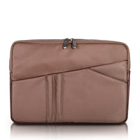 Padded Laptop Sleeve With Leather Accents. Fully-Lined Interior. Easy Access Front Organizer For Pens And Small Accessories. Silver Accent Hardware And Metal Zippers. Back Full-Length File Pocket.