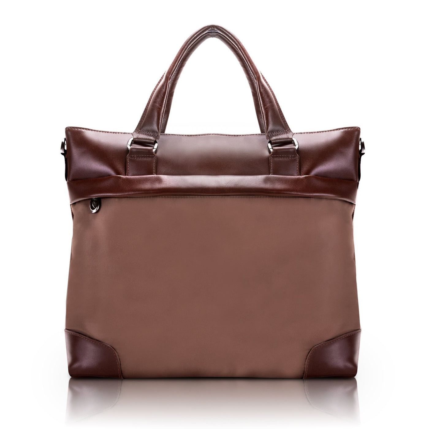 Modern, Fully Lined, Nylon Briefcase With Leather Accents. Padded Laptop Compartment Included. Interior Tablet Pocket With Organizer For Business Cards, Pens, And Accessories. Secure Full-Length Interior Zippered Pocket. Silver Accent Hardware And Metal Zippers. Exterior Front Zipper File Pocket. Removable And Adjustable Nylon Strap With Leather Shoulder Pad.