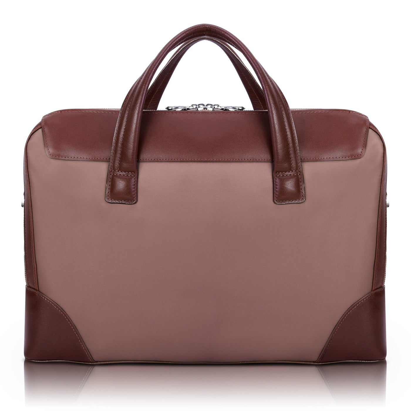 Structured Nylon Briefcase With Leather Handle And Accents With Silver Accent Hardware And Metal Zippers. Fully-Lined Interior With Leather Accents. Front Compartment Features Dual Tablet Pocket With Organizer For Business Cards, Pens, And Accessories. Spacious Back Compartment Features A Padded Laptop Compartment. Back Leather Trimmed Easy Access Pocket. Leather Backside Slit Feature For Easy Attachment To Rolling Cases. Removable And Adjustable Nylon Strap With Leather Shoulder Pad.