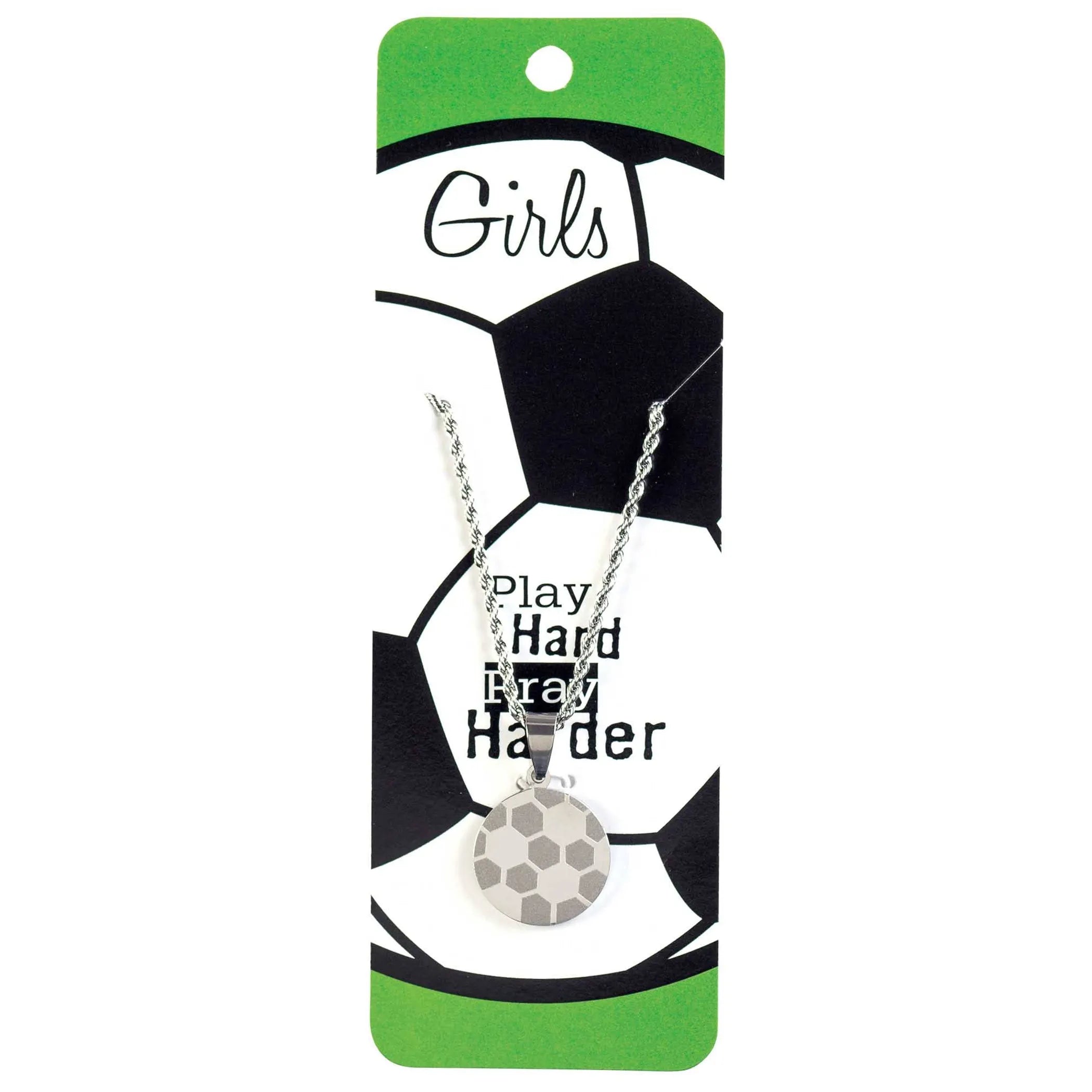 Soccer Sports Necklace For Young Ladies Features A 13/16' Stainless Steel Round Pendant With Soccer Ball Design On Front That Is Created With A Combination Of Polished And Matte Finishes.
