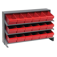 The Pick Rack Is A Bench-Style Storage Solution With Sloped Shelves. It Measures 12-1/2L X 36W X 23H And Has A Capacity Of 250 Lbs. The Rack Features Three Shelves And Comes With A Configuration That Includes 18 Qed601 Red Bins. This Setup Provides Ample Storage Space And Easy Access To Items.