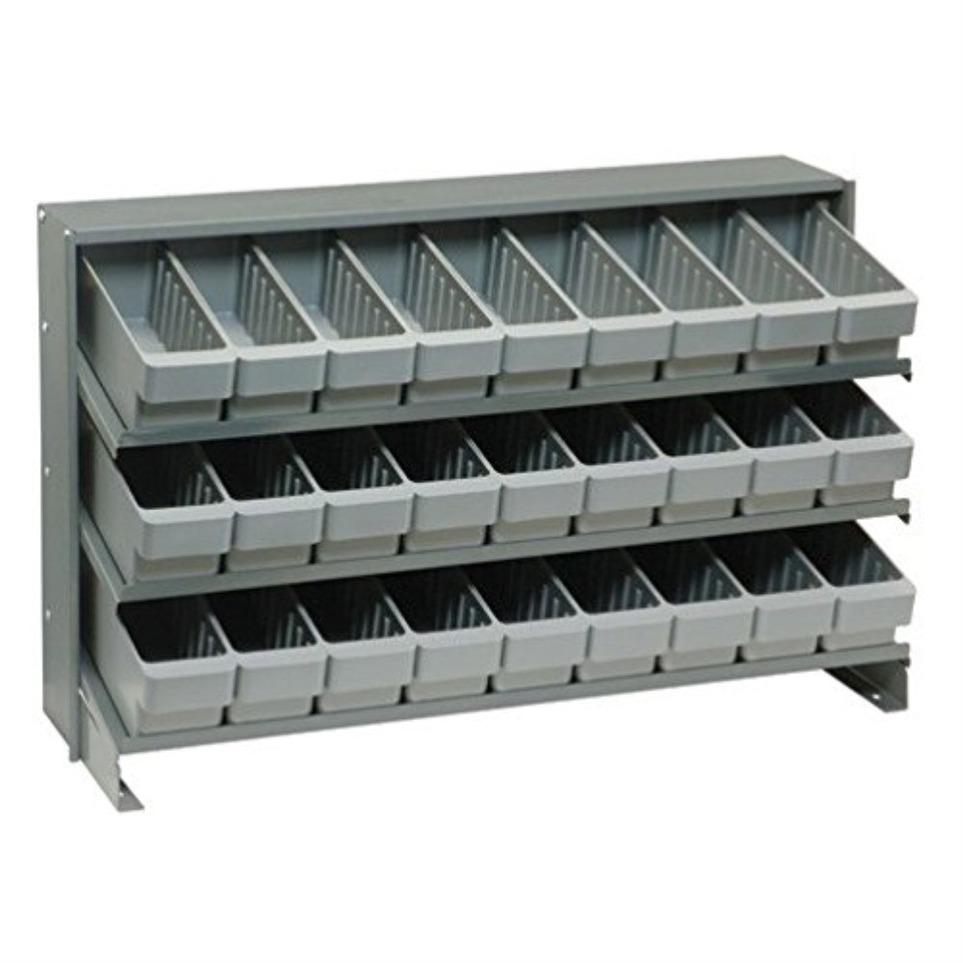 The Pick Rack Is A Bench-Style Storage Solution With Sloped Shelves. It Measures 12-1/2L X 36W X 23H And Has A Capacity Of 250 Lbs. The Rack Features Three Shelves And Includes A Total Of 27 Gray Bins (Qed501) For Organizing And Storing Items.