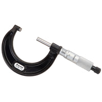 The Starrett 436.1 Outside Micrometer Features 1-2 Range, Ratchet Stop, Lock Nut, Carbide Face, .0001 Grad, Ratchet Stop, Lock Nut, Carbide Faces
