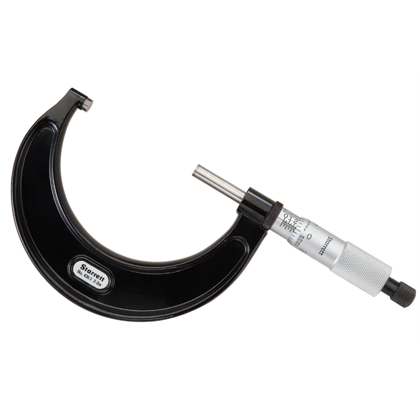 The Starrett 436.1 Outside Micrometer Features 2-3' Range, Ratchet Stop, Lock Nut, Carbide Face, .0001 Grad, Ratchet Stop, Lock Nut, Carbide Faces