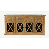 The Telluride Collection Is The Essence Of Rustic Country Style With Distressed Solid Pine Handcrafted Into Spectacular Furniture Perfect For Any Room In Your Home. Each Piece Is Unique With Subtle Distressing That Brings Out The Beauty Of The Natural Wood. This Fully Assembled Four Drawer Sideboard Accent Chest Is A Great Addition To Any Room In Your Home Combining Style And Countryside Charm In A Distinctive Package. Four Full Size Drawers With Solid Metal Handles Provide Generous Storage Up Top, While The Bottom Features Four Sleek Black Grill X-Style Doors With An Additional Large Shelf To Round Out The Look. Great In Virtually Any Room In Your Home, This 70' Accent Cabinet Makes A Bold Statement Of Sophisticated Style While Creating A Welcoming Atmosphere.