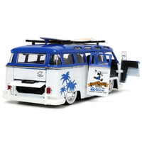 Volkswagen T1 Bus Blue And White With Graphics 'Nostalgic Islands Ride The Wave' And Mickey Mouse Diecast Figure And Surfboard 'Disney'S Mickey And Friends' 'Hollywood Rides' Series 1/24 Diecast Model Car By Jada