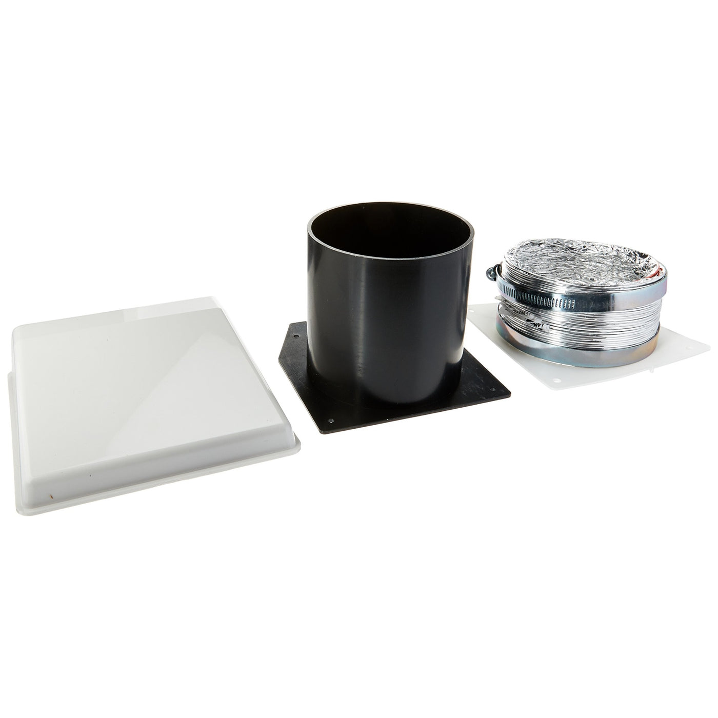 Streamlined Profile, Smaller Footprint And Easier Installation Than Previous Models.Only Two Screws To Install Vent Cover--Special Hidden Tabs Lock Over The Flap/Insect Seal. Kit Includes Vent Cover, Metallic Flexible Ducting, Screw Clamps, Flap/Insect Seal With Built-In Tailpipe And Four Screws, Plastic Interior Ring And Two Vent Cover Screws. 6 1/2'H X 6 3/16'W X 1 5/8'D.