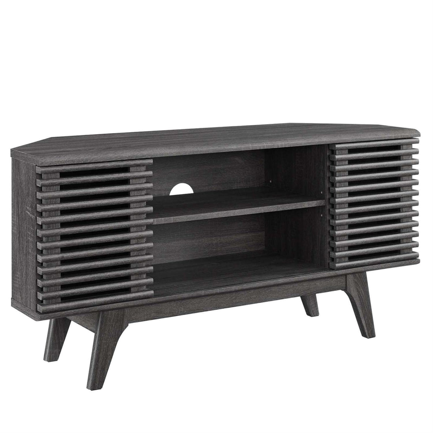 Introducing The Render 46 Corner Tv Stand, A Perfect Fusion Of Mid-Century Aesthetics And Modern Functionality. Impeccably Designed, This Stand Showcases A Sleek Walnut Grain Veneer And Is Supported By Four Solid Wood Tapered Legs, Exuding An Air Of Elegance. It Boasts Adjustable Shelves And Two Slatted Sliding Doors, Offering Both Convenience And Style For Your Media Storage Needs. The Inclusion Of Non-Marking Foam Foot Pads Ensures Stability And Protects Your Floors. Additionally, The Stand Features A Cable Management Hole, Keeping Your Wires Organized And Out Of Sight. With Its Slanted Sides, It Can Accommodate Tvs Up To 50'. Assembly Is Required. Enhance Your Living Room, Lounge, Or Recreation Area With Render'S Contemporary Linear Style, Elevating The Overall Ambiance.